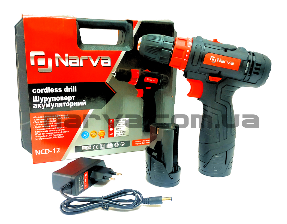- Что вы получаете: Аккумуляторный шуруповерт Narva NCD-12 поставляется с 2 литий-ионными аккумуляторами емкостью 2000 мАч; 1 зарядное устройство для аккумулятора; Руководство пользователя; 1кейс для переноски и хранения инструмента.