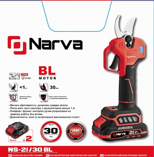 Акумуляторний електричний секатор NARVA NS-21-30 BL: Подвійна автономність та професійна точність